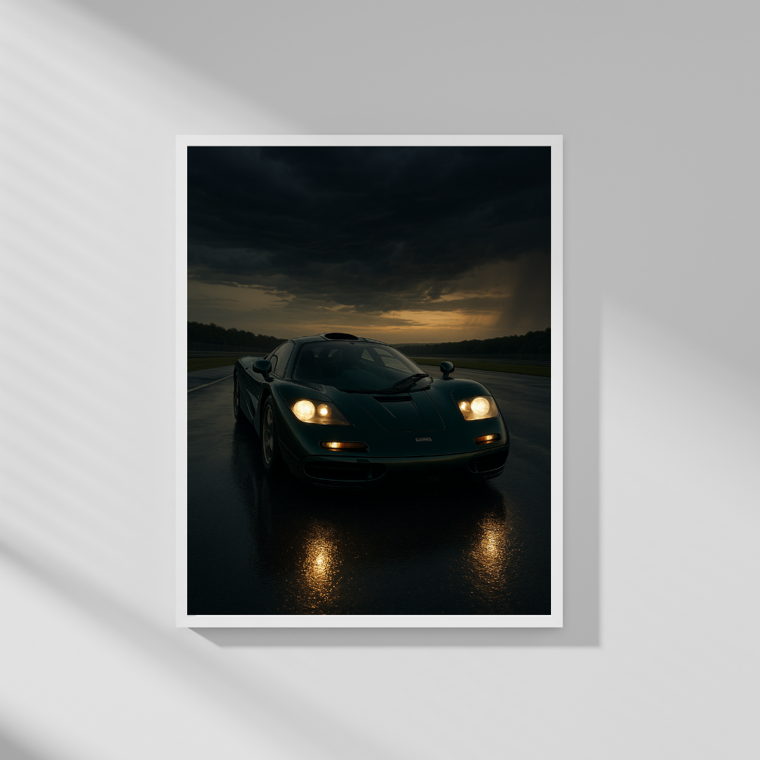 “Can you show a Dark Green McLaren F1 driving on a racetrack at dusk? Headlights on, reflections on the track, dramatic sky but still elegant”