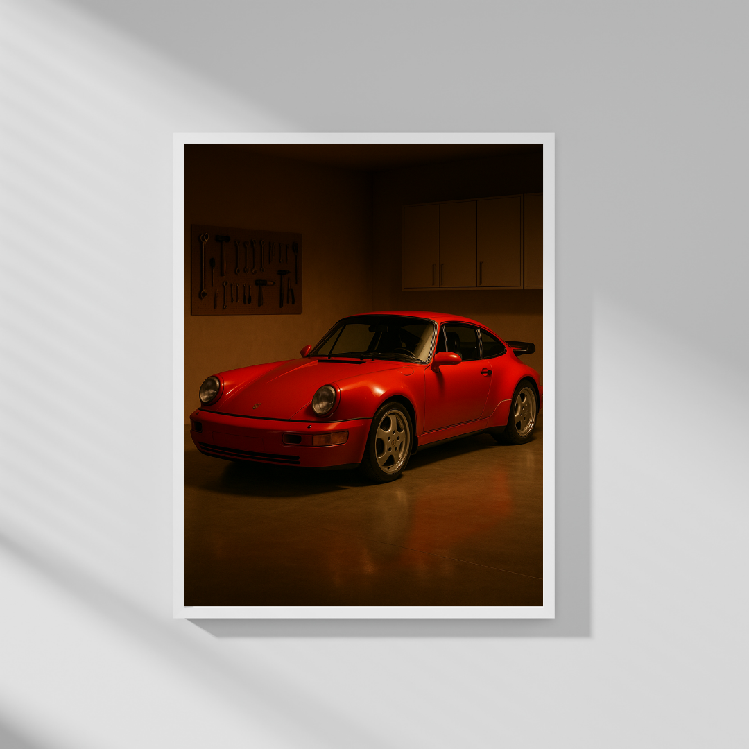 “I’d like my Guards Red 964 Turbo inside a modern garage with soft warm lighting. Please show it from a front angle with subtle reflections on the floor and a clean, moody atmosphere.”