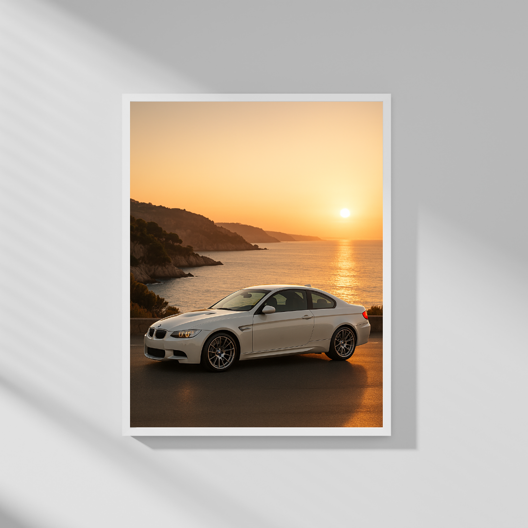 "Could you create my Alpine White e92 M3 parked on a coastal road at sunset, overlooking the ocean and cliffs? I’d like warm golden light and a clean, cinematic feel. Side-on view with minimal background distractions"